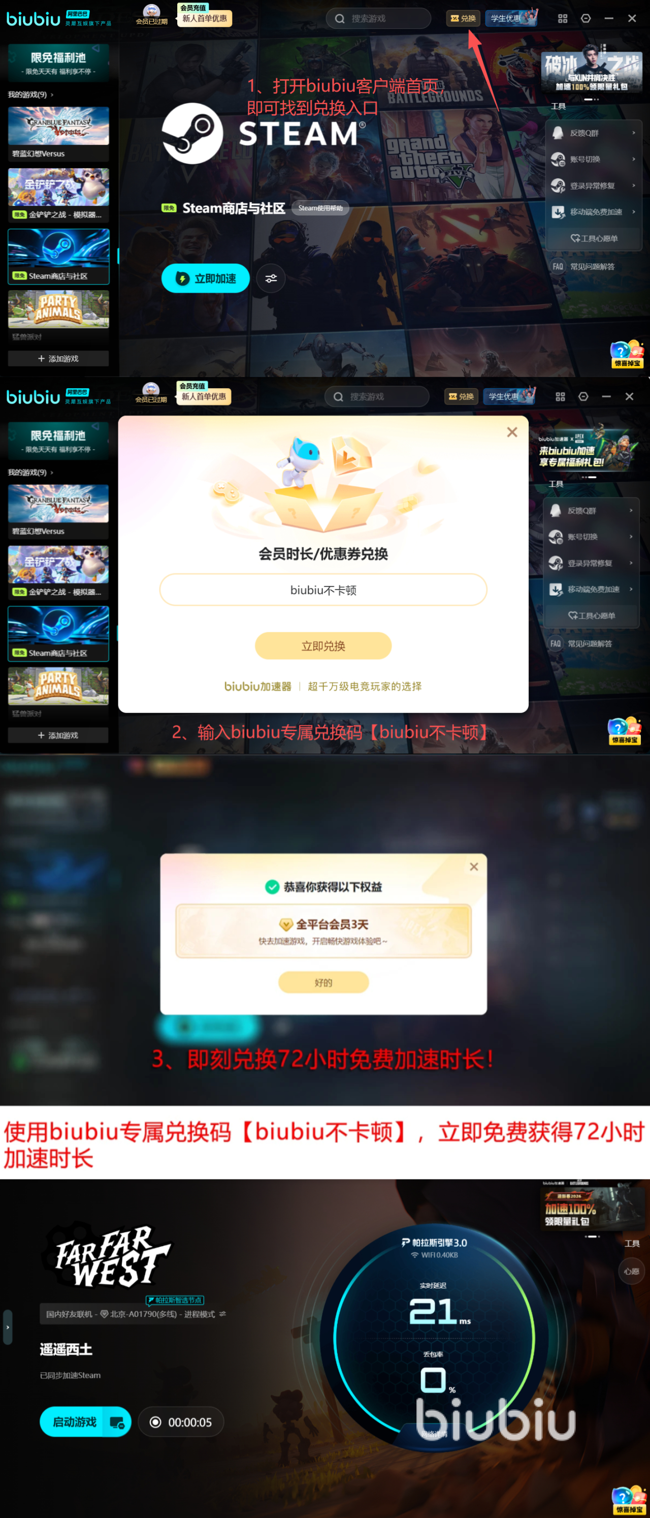 当下正处于体验biubiu加速器强大功能的绝佳时节!平台致力于使新用户奖励得到实惠,首次注册的用户都能够获取长达24小时免费加速优待,如使用者在客户端输入专属口令【biubiu不卡顿】,即可额外获得72小时优质加速时长,累计96小时的免费畅快体验,足以让你与伙伴们在遥遥西土的壮丽荒漠中无惧任何网络风沙,将拓荒传奇进行到底。