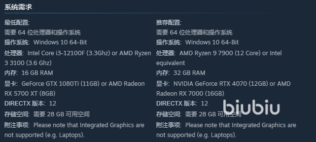 开启护林工作要满足如下基本运行门槛,操作系统Windows 10至少需要Intel Core i3-12100F(3.3GHz),内存16GB以上保证基础任务的顺利执行。推荐NVIDIA GeForce GTX 1080 Ti(11GB显存)来保证基本的画面表现。DirectX版本为12,预留至少28GB硬盘空间给游戏使用。