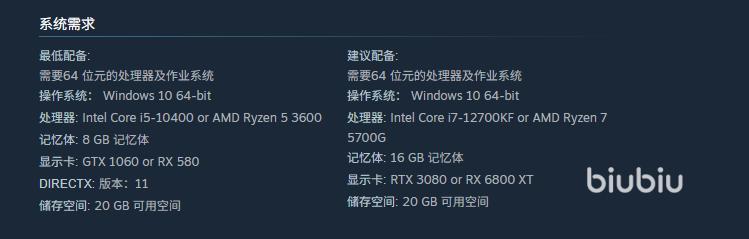 很多时候steam商店游戏页面给到的系统需求里,最低配置只是能玩的最低标准,并一定能流畅玩,所以更多是以“推荐配置”作为参考。这里推荐至少64位win10系统,12代i7处理器或者同级别的amd锐龙7处理器。