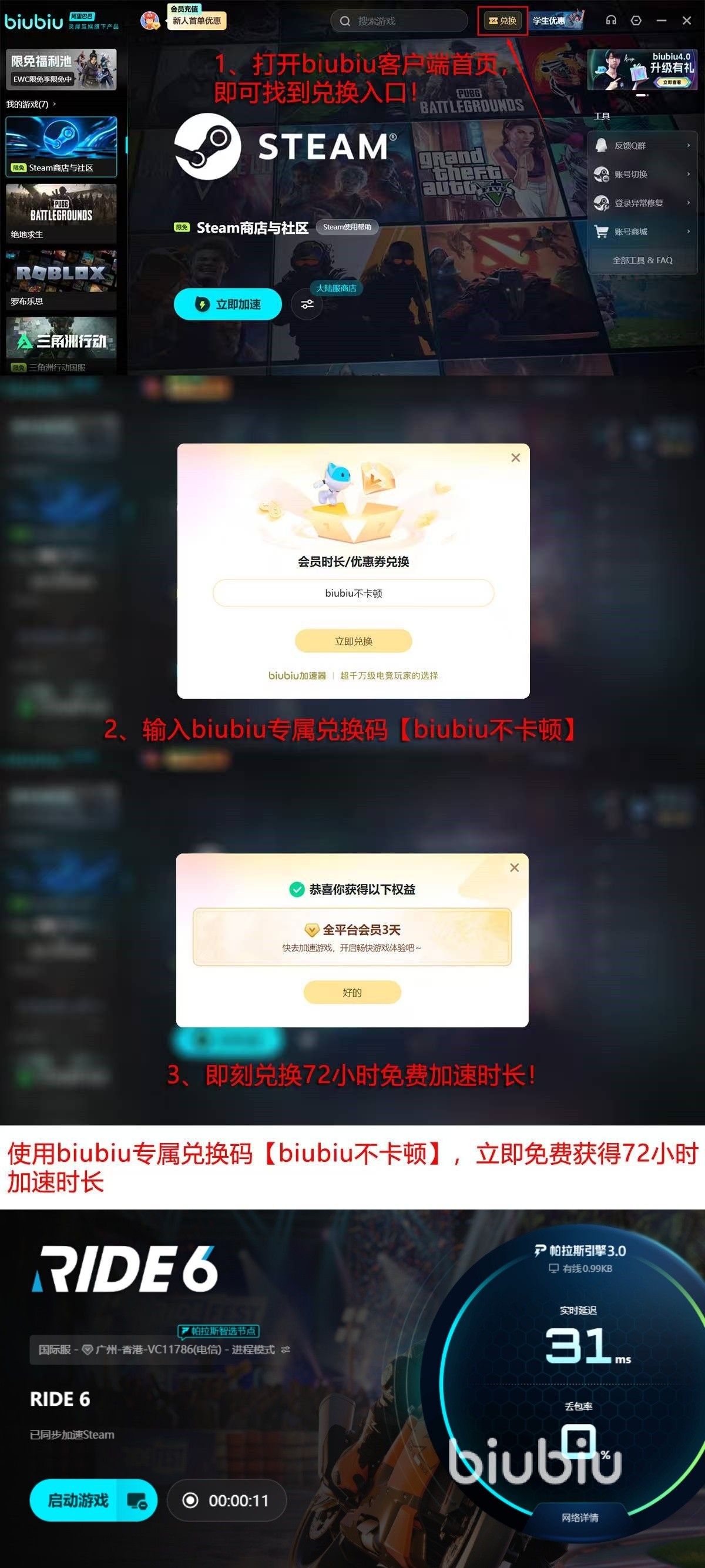 这一点也是得到PUBG职业冠军选手左梓轩深度认同的,他曾亲身参与到多次高强度测试中,日常训练也使用biubiu辅助,也是对产品的进一步肯定。现在新注册用户还有1整天免费体验时间,所有用户通过“biubiu不卡顿"兑换码都能再获得3天时长。