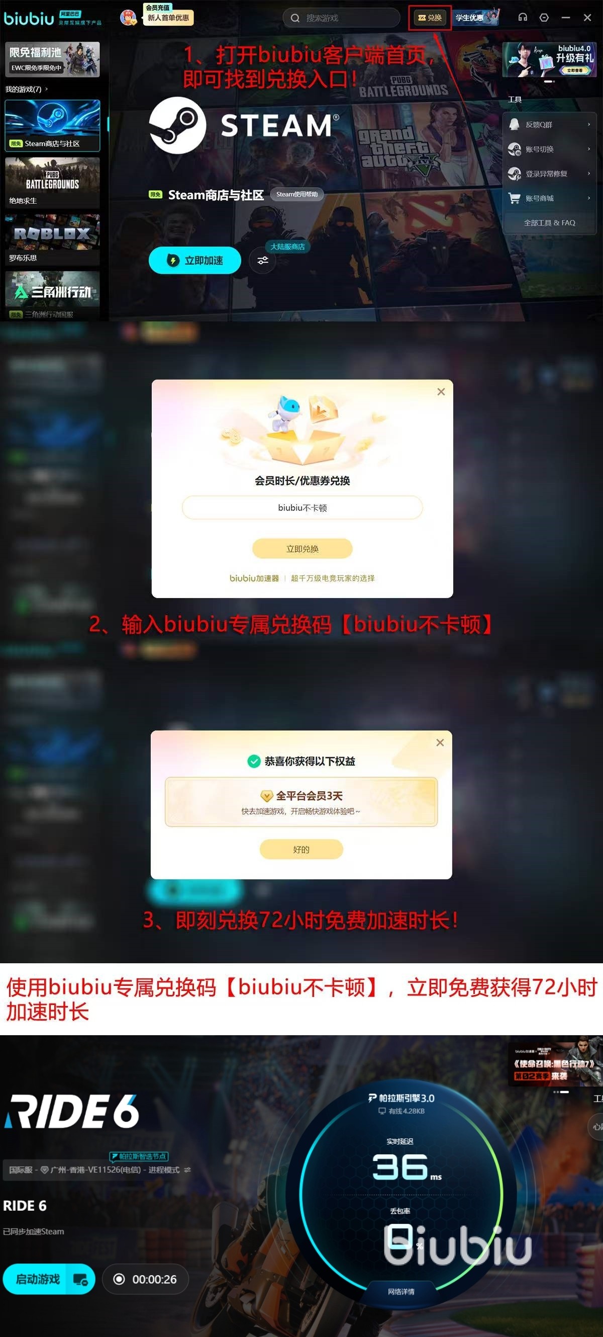 此外除了加速效果极为优秀外,加速器的福利活动也是不差的,拥有【biubiu不卡顿】兑换码兑换72使用时长的福利活动,和新用户注册免费领取24小时体验时间的福利活动,一共可以领取到96小时的白嫖时间,所以综合来看不管是福利还是加速素质都极为的优秀,因此才推荐去用。