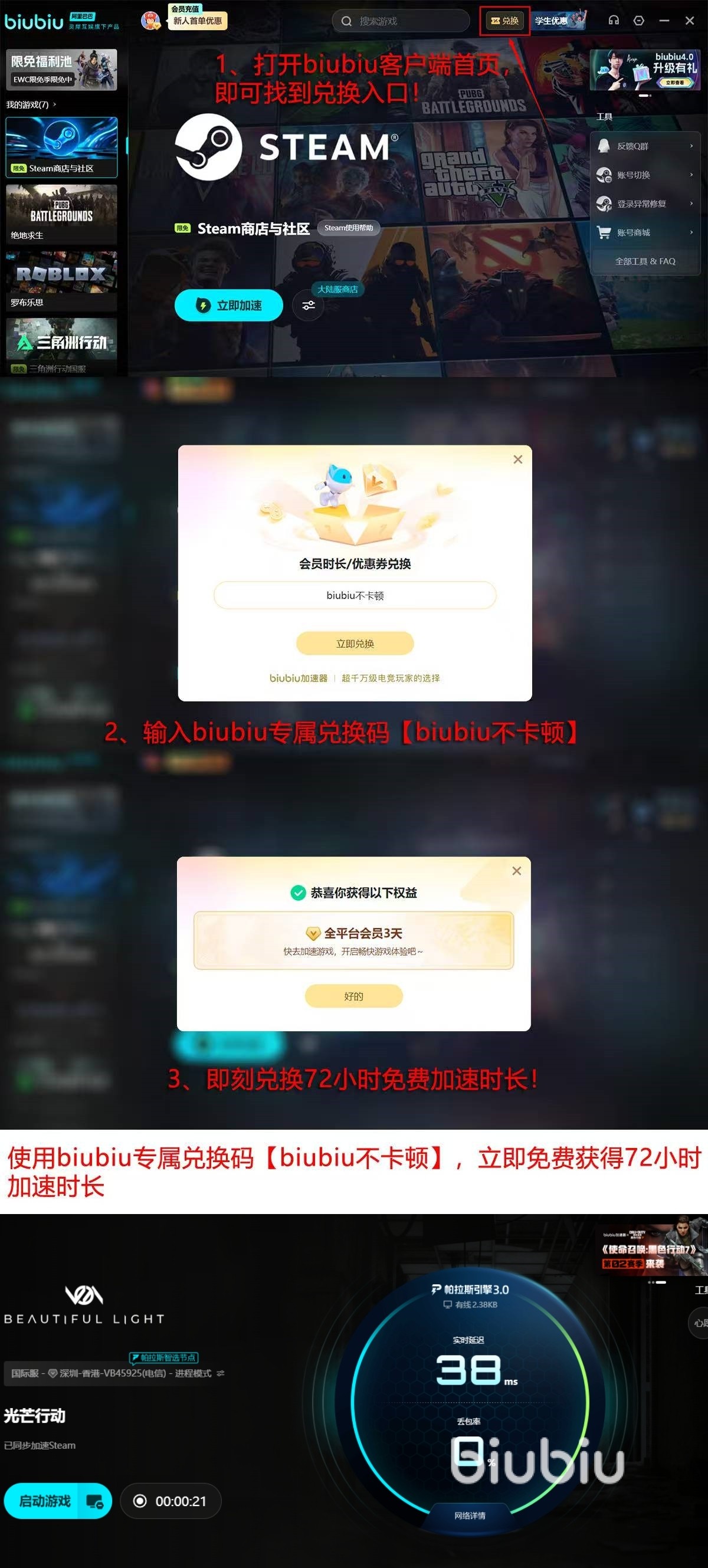 该加速器因为采用了独立自主研发的帕拉斯3.0引擎的缘故,加速效果非常出色可以让玩家购买游戏后续游玩游戏变的非常顺利,此外除了效果好可以优化游戏的购买游玩外,还拥有【biubiu不卡顿】兑换码兑换72小时使用时长,和新用户注册免费领取24小时使用时间的福利活动,福利也是非常丰厚的。