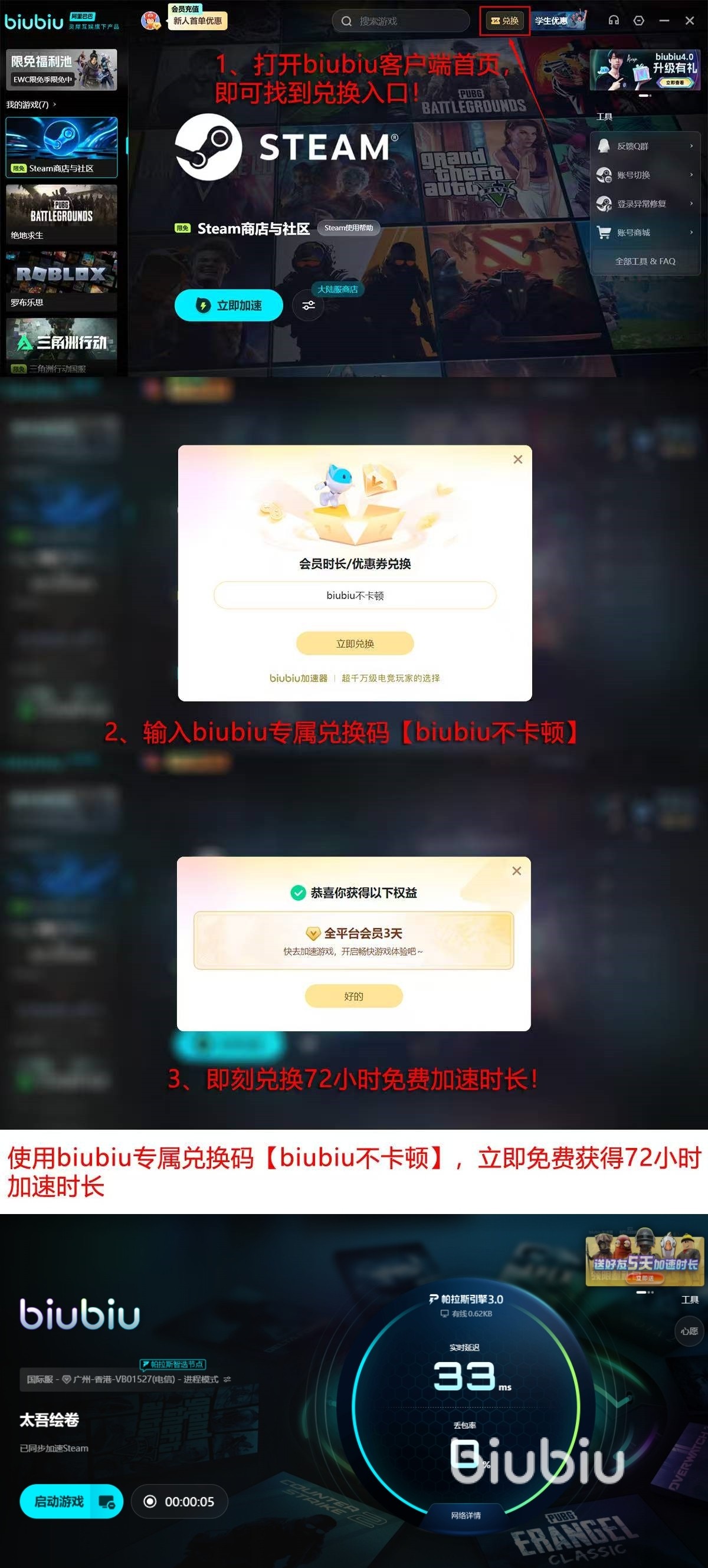 这是目前市面上综合性能最强的加速器,采用了独立自主研发的帕拉斯3.0引擎,为玩家提供了一个完美的加速体验,不管是游戏购买还是游玩都可以进行加速,因此就和pubg明星冠军选手xdd达成了合作,这也证明了加速效果确实好,另外还有不错的【biubiu不卡顿】兑换码3天和新用户注册免费领取24小时体验时间这两项福利活动,可以说福利也相当的不错。