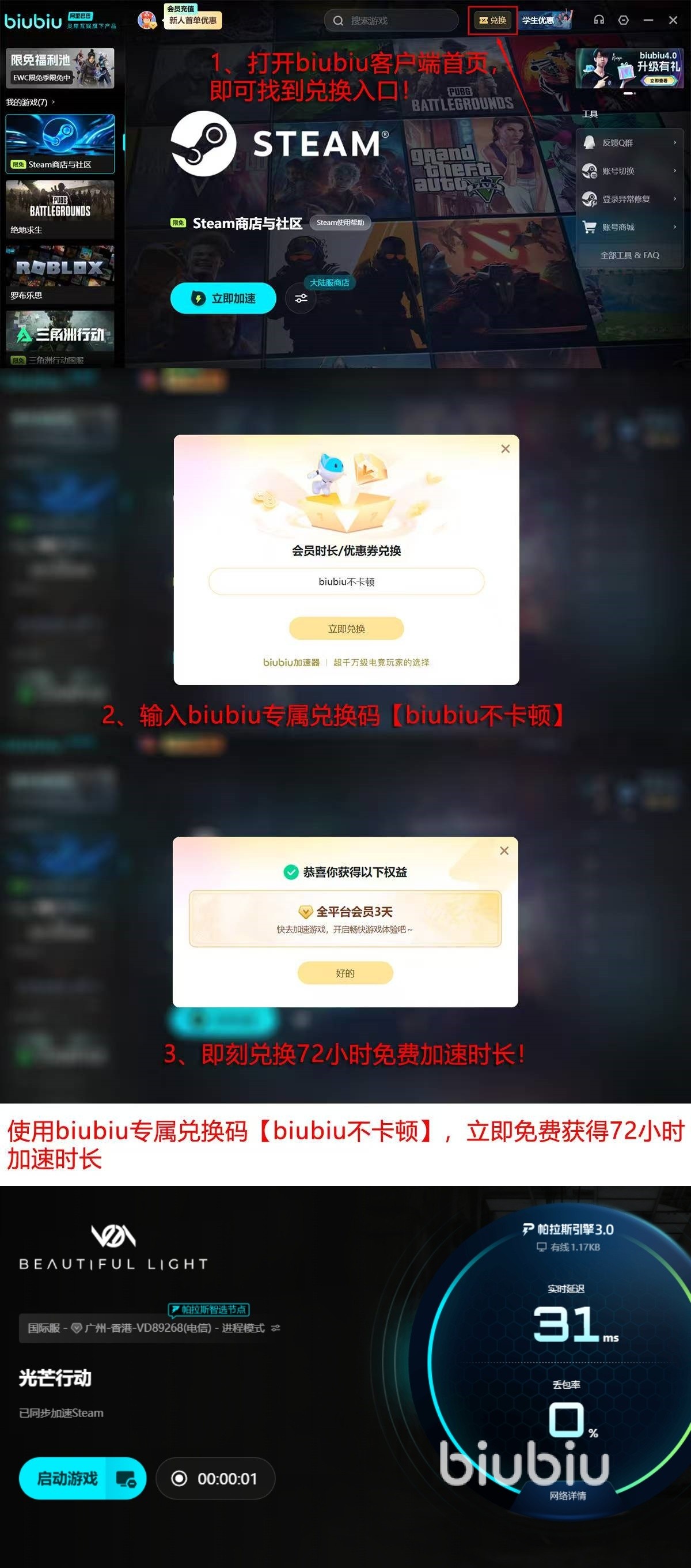 现阶段新人在第一次使用这款加速器是有着福利的。他们可以获取到24小时的免费加速功能。如果使用兑换码【biubiu不卡顿】,则是可以额外的获取到3天的免费加速时间。