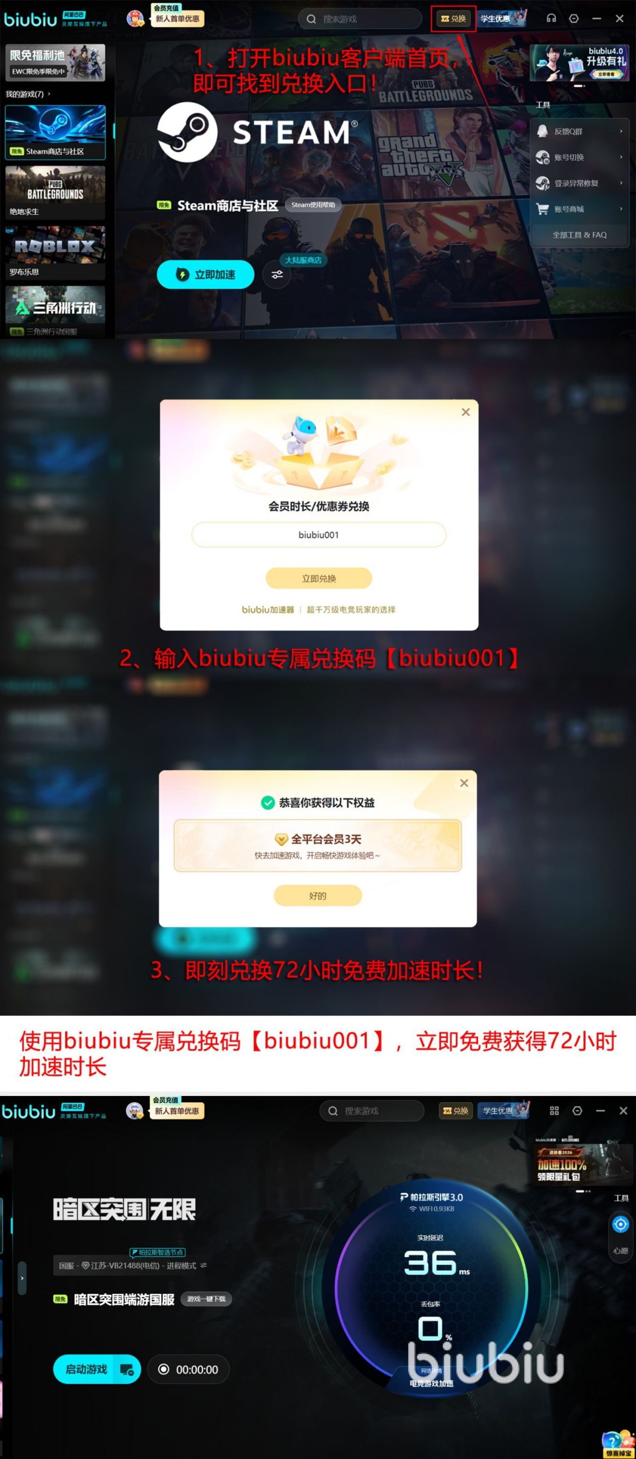 biubiu加速器不仅会拥有出色的适应性,同样也给所有的玩家推出了专属的免费福利,所有的人都可以轻松的获取。【biubiu001】是一个专用口令,在兑换之后可以免费长达3天,没有使用的限制性,对于新用户而言,不需要额外的操作,还可以在首次注册登录之后,领取24小时免费口令。最终就可以免费96小时,相当于可以免费使用4天,让玩家可以摆脱闪退的困扰,同时也可以享受流畅的对局。