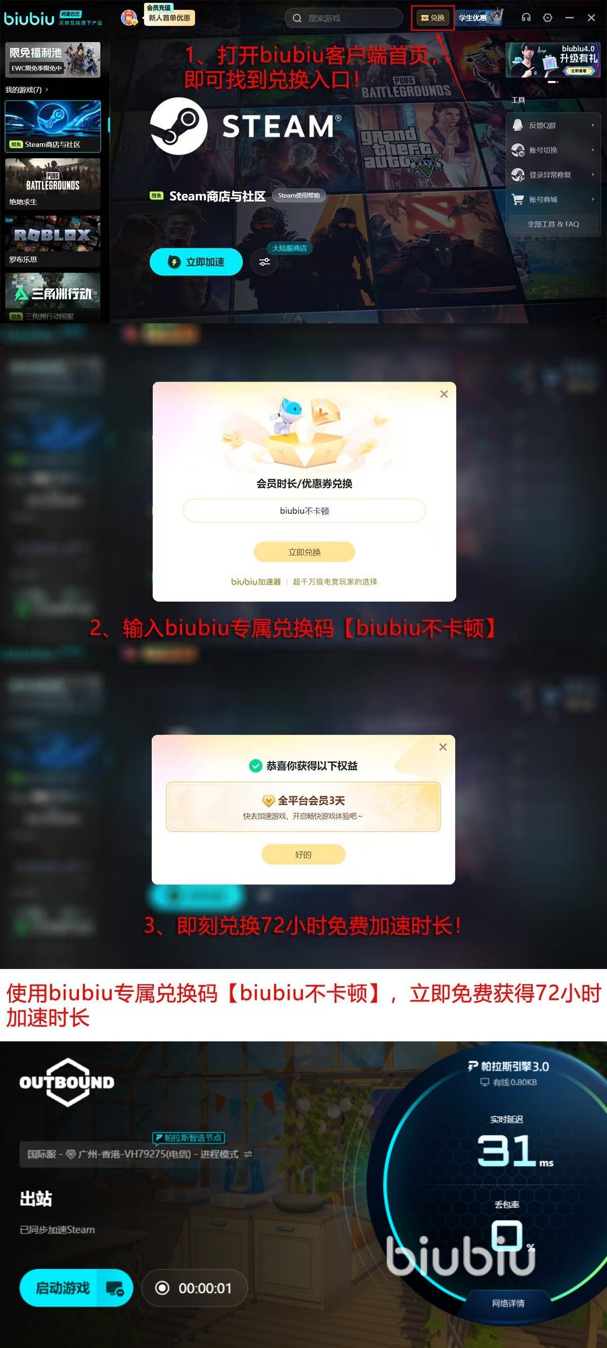 冠军选手Aixleft还与biubiu合作,他作为体验官尽职尽责,共同参与到压力测试之中,并给到有效建议,让产品性能更加优秀;如果是全新注册的朋友,还获取24小时会员加速服务,觉得时长不够,“biubiu不卡顿”额外兑换72小时,总计96小时。