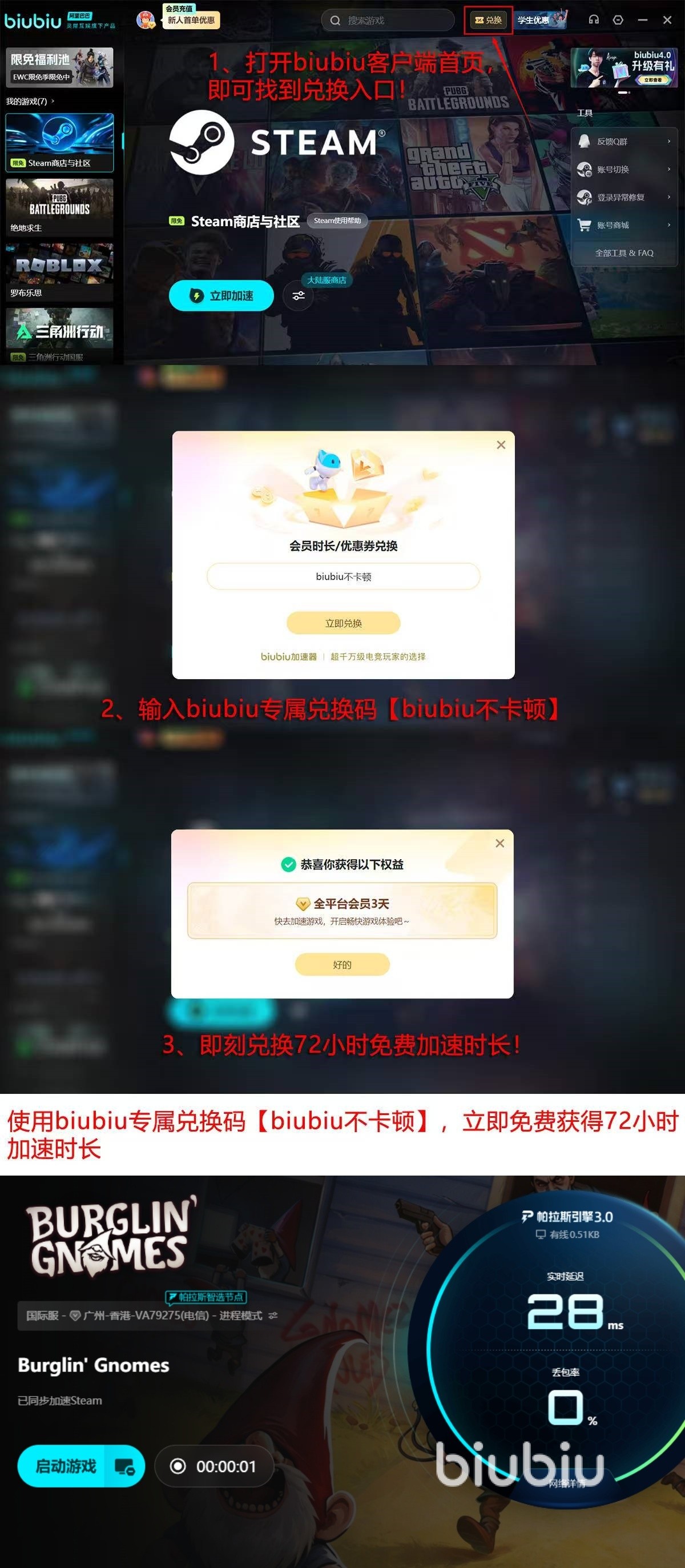 职业电竞选手Aixleft也是与官方合作,作为体验官的他,不仅是参与压力测试,感受产品性能,日常训练也是搭配biubiu使用,很是可靠。新注册账号的用户还即刻发放24小时会员加速效果,“biubiu不卡顿”暗语输入后,72小时会员服务直接到手,累积为4天免费时长。