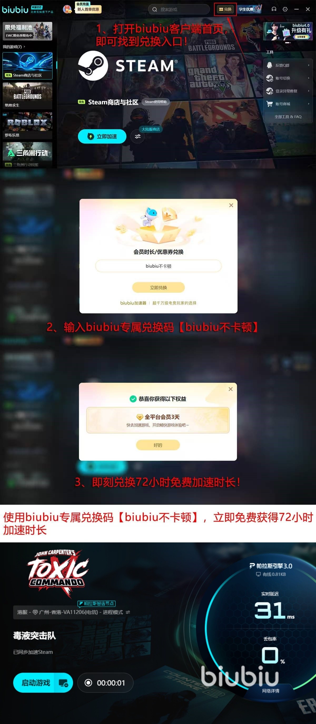 还有专业电竞人员对产品给予肯定,PUBG全球赛事冠军小叮当受邀作为产品代言人,亲力亲为对工具性能进行测试,进一步提升加速效果;作为新注册朋友,还有24小时免费加速机会,后续通过“biubiu不卡顿”“兑换码额外再兑换72小时加速时长。