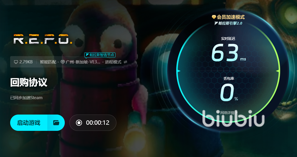 交互体验方面,biubiu延续极简设计理念:主界面支持《REPO》游戏名称一键检索,点击“立即加速”后自动完成协议匹配、节点优选与加密隧道建立,全程无需手动配置IP、端口或DNS。加速运行期间,悬浮窗实时显示当前网络延迟数值、数据包收发成功率及加速状态标识,便于玩家即时判断链路健康度。整个过程严格遵循ISO/IEC 27001信息安全标准,不读取、不存储、不转发任何游戏内行为数据,确保运行安全合规。
