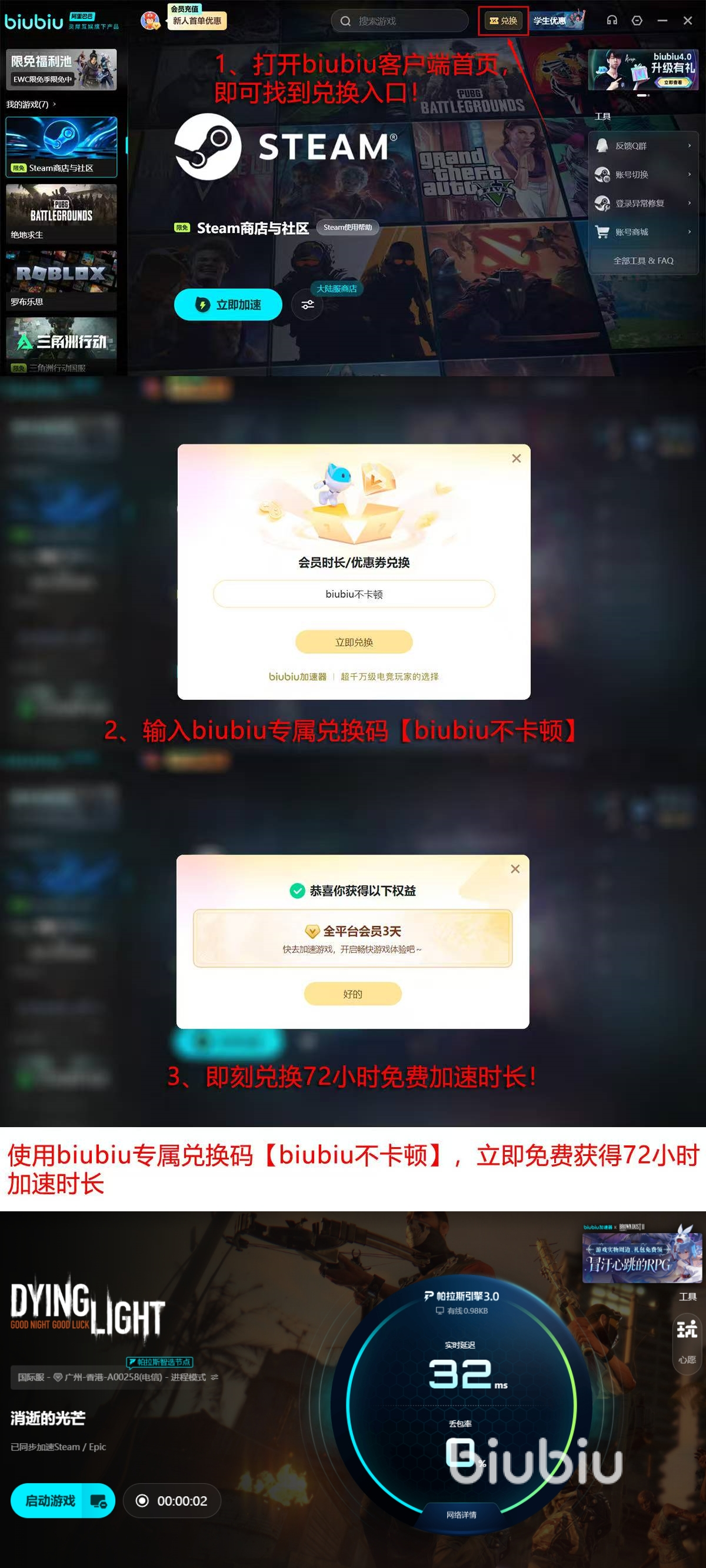 除了拥有非常不错的加速效果外,还拥有非常不错的福利活动和海量游戏库,其中福利活动拥有使用【biubiu不卡顿】兑换码兑换三天使用时长和新用户注册免费获取24小时使用时间这两种,加一起就是说可以白嫖96小时的使用时长,海量游戏库指的则是加速器对市面上能看到的所有的热门游戏进行了收录,并且给到了多区服节点的选择从而让用户不管是玩什么游戏,有加速需求的话都可以在上面找到并且进行加速,也正因为拥有这些优点才会说是综合性能第一的加速器。