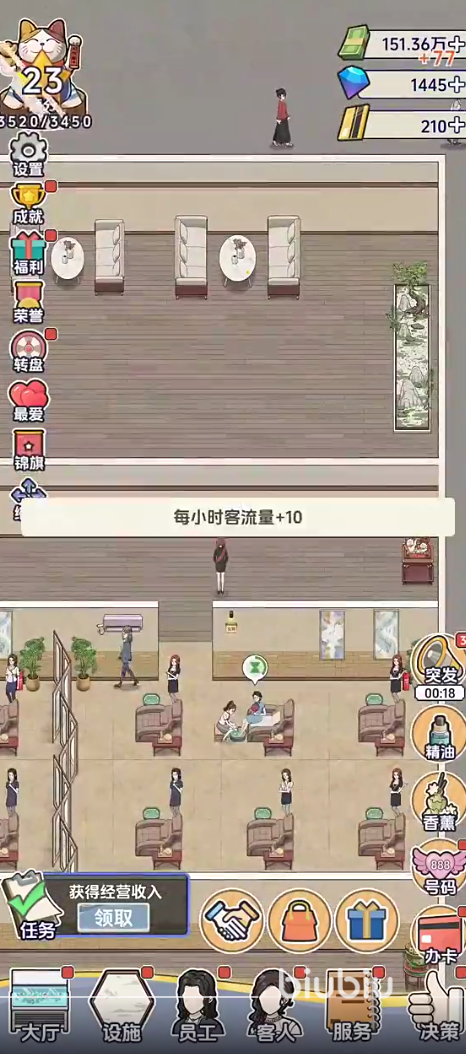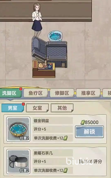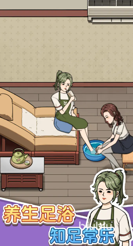 在玩法层面,游戏构建了完整的商业闭环:玩家需平衡客流管理、服务质量、成本控制与口碑建设。例如,当顾客投诉水温不适或技师排班混乱时,需即时调优;随着好评积累与资金增长,可逐步升级门店面积、更换高端洗足设备、增设修脚、鱼疗、推拿按摩等增值项目,并搭配香薰、精油等配套服务模块,有效提升单客消费价值与复购率。