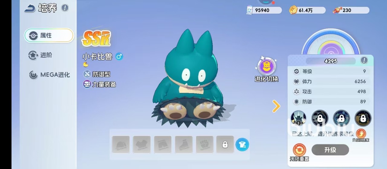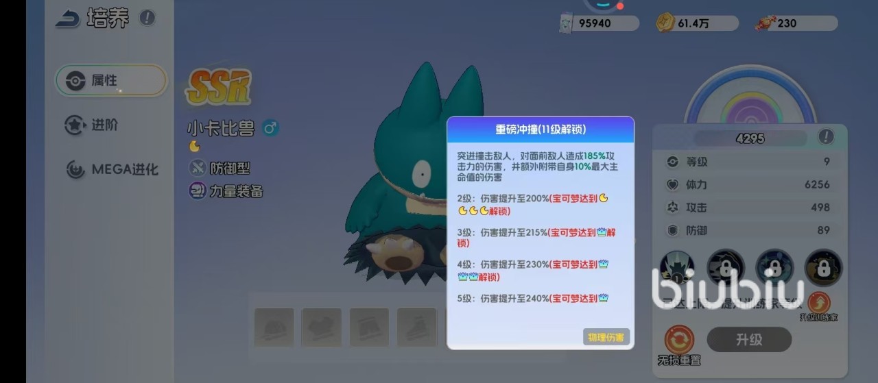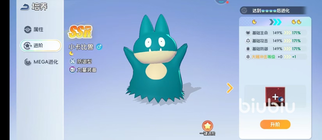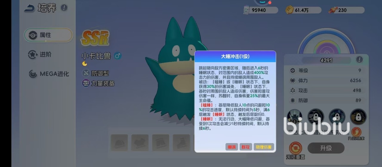 从基础面板切入,小卡比兽初始体力值达6256点,在同等级宝可梦中处于顶尖梯队。配合其明确的防御向定位,使其在游戏前期即可稳定承担承伤任务,为后排输出单位争取关键的站桩空间。它不以爆发伤害见长,而是作为容错率极高的体系支点存在。升阶过程中,生命值与防御力呈线性稳健增长,确保中后期依然具备高强度抗压能力;同时,核心技能随阶数提升同步强化,形成“越战越强”的持续进化路径。