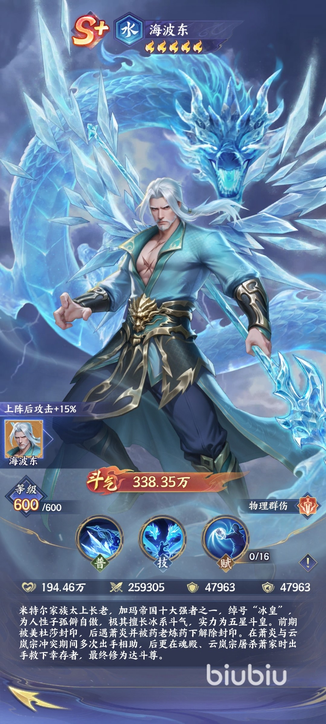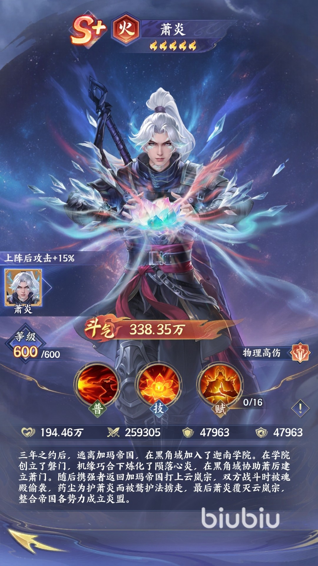 萧炎(火·物理高伤):原著主角,延续高爆发火系物理输出设定。普攻专注单体破防,技能“陨落心炎”可对敌方前排目标施加破甲效果,大幅削弱其防御能力。天赋随战斗进程持续提升自身攻击力,形成越战越强的成长曲线。与美杜莎协同作战时,可借助其控场与灼烧效果,快速完成前排突破并切入后排,是物理核心流派不可或缺的主力输出。