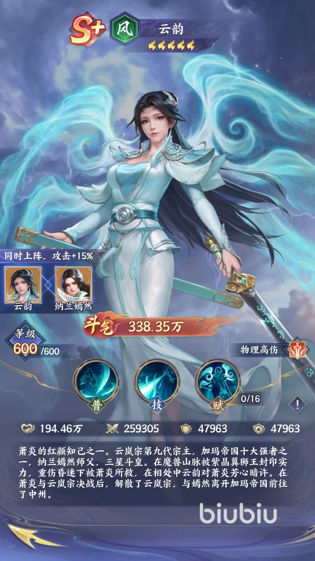 云韵(风·物理高伤):以精准单体打击见长的高爆发物理角色。普攻具备穿透特性,可无视部分防御直接作用于目标本体;大招“风刹湮罡”锁定敌方后排单位实施突袭,配合天赋暴击率加成,具备一击瓦解敌方核心输出的能力。与纳兰嫣然激活羁绊后,全队获得15%攻击力提升,进一步放大其秒杀效率,适用于针对战术明确的竞技场景。