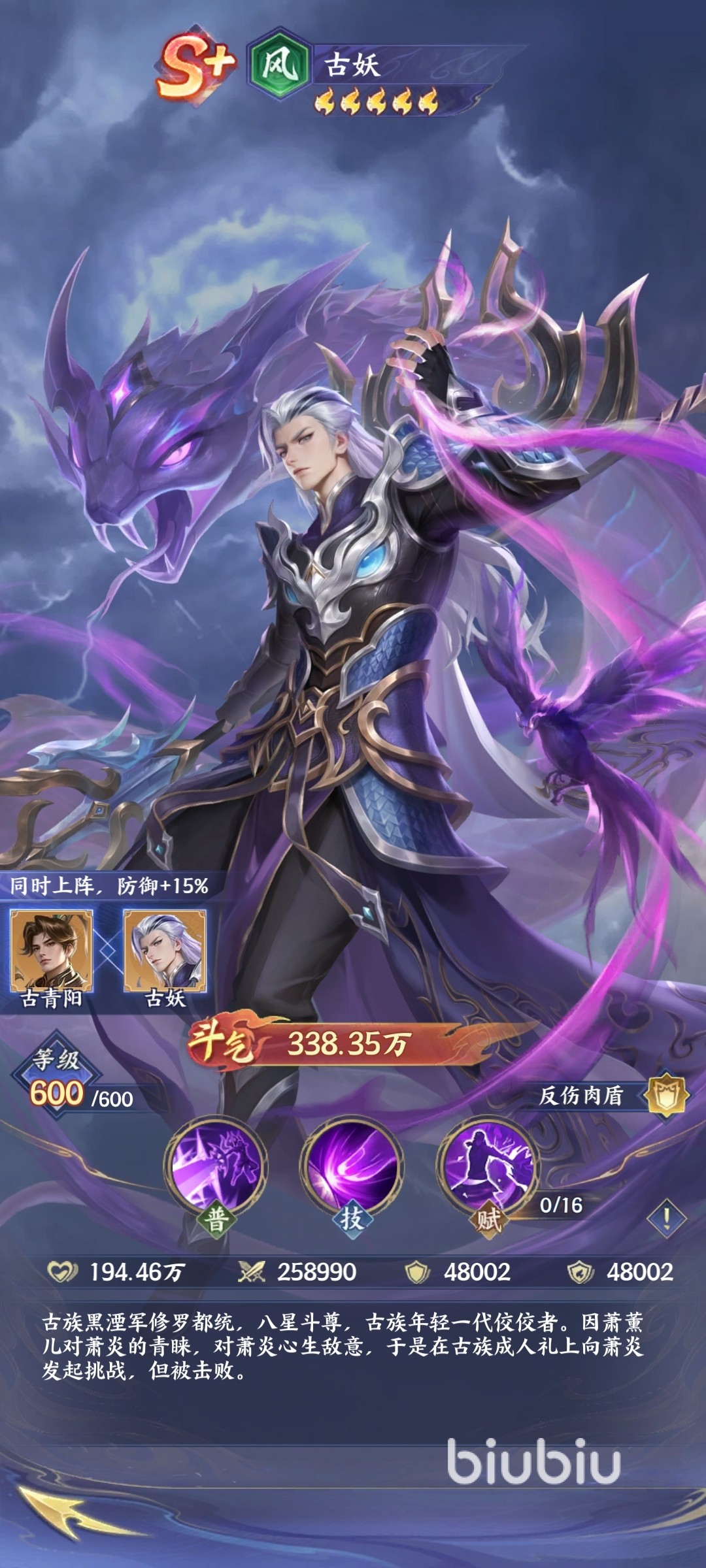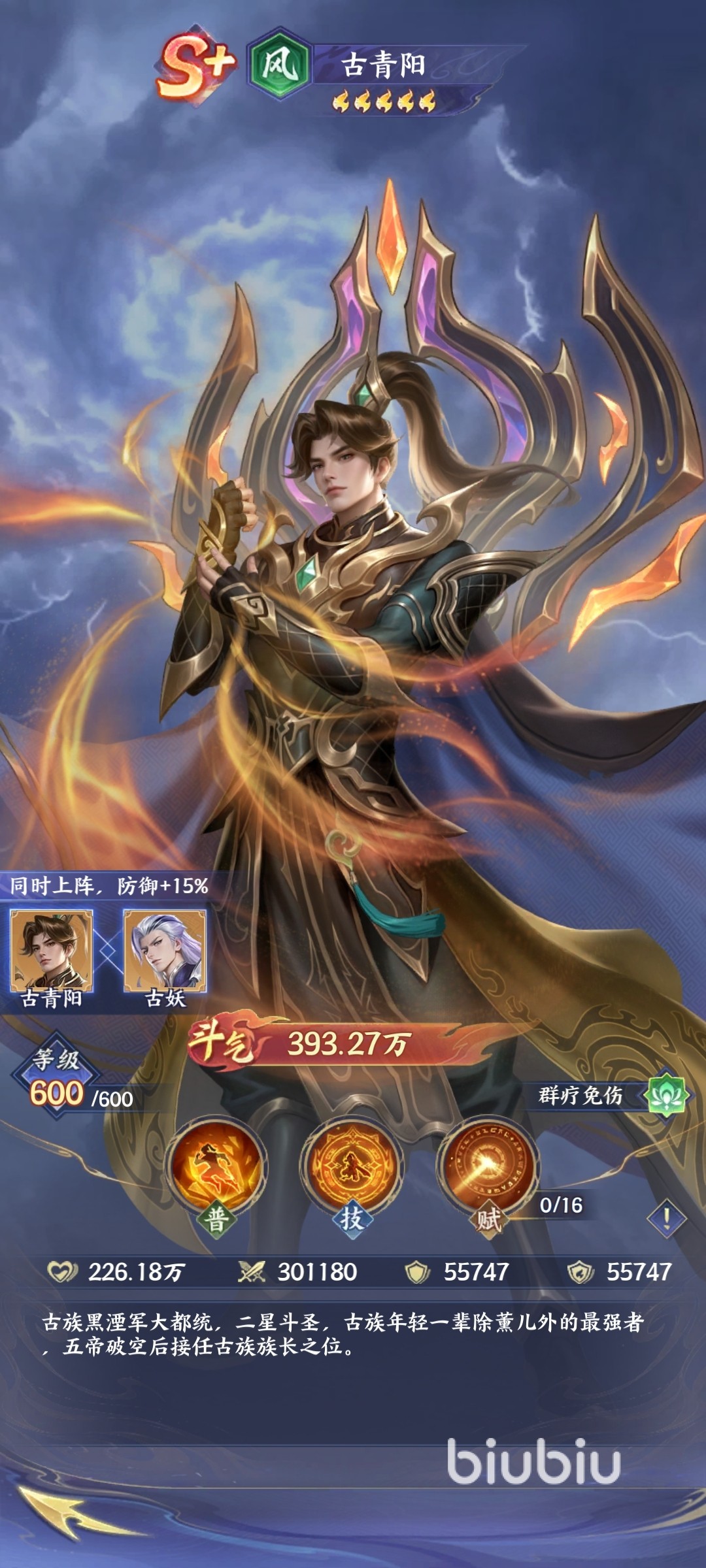 古青阳(风·群疗免伤):稀缺型团队守护者,兼具群体治疗、护盾生成与控制解除三重功能。普攻“古族守护”为队友施加护盾,技能可进行范围治疗并清除全体友方控制状态。当队友生命值低于50%时,天赋自动触发短时高额免伤护盾,大幅提升极限反打容错率。与古妖激活羁绊后,额外提供15点防御属性,使其在承担治疗职责的同时具备可观承伤能力,尤其适配多控流、快节奏PVP环境。