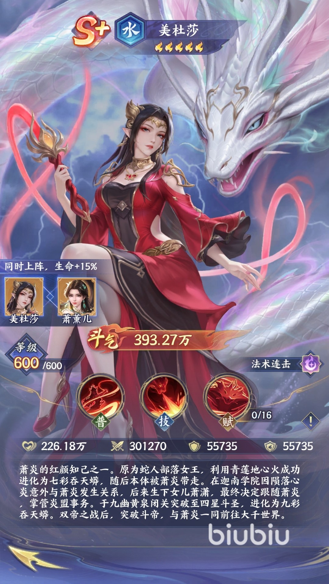 美杜莎(水·法术连击):主打高频法术爆发的输出型角色。普攻“蛇影噬心”可触发多段法术伤害,大招“七彩吞天蟒”对敌方全体造成高额法伤并附加持续灼烧效果。配合天赋“九彩净化”,每次攻击均有概率额外触发一次连击,显著提升瞬时DPS。与萧薰儿组成羁绊后,可获得15%生命加成,强化其战场生存能力,适合搭配高机动性或减益辅助组建速攻体系。