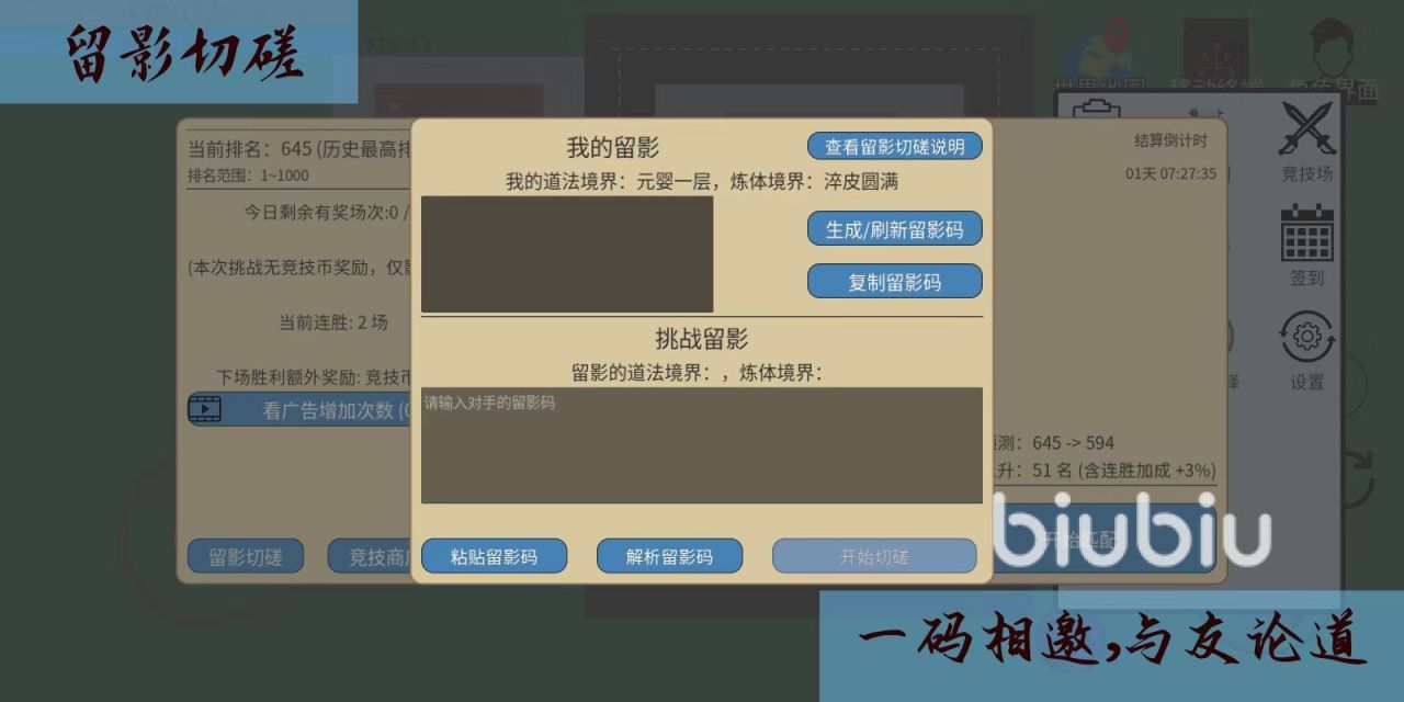 本作主打“离线修仙+异步PVP”双轨机制。角色在离线状态下可持续积累修为、采集资源、突破境界,真正实现“挂机即成长”。每日仅需投入数分钟进行关键操作,即可维持高效养成节奏。其独创的“留影码”系统,允许玩家一键生成含完整配装、功法、流派信息的角色快照,分享至社交平台或好友后,对方扫码即可发起挑战——全程无需实时在线,胜负完全取决于流派构筑、词条搭配与策略预判。