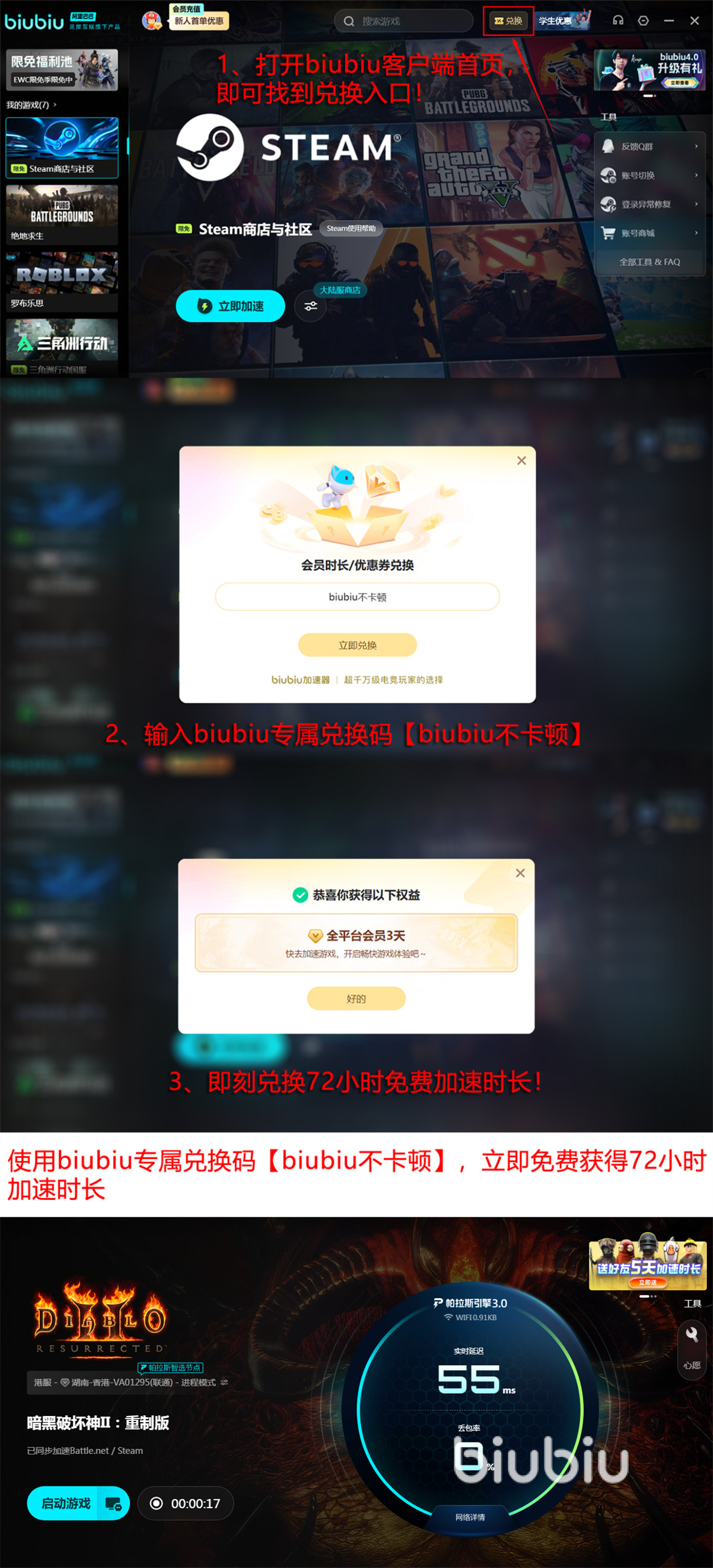 现在抓紧注册一个号,利用新人免费加速24小时的福利,打开biubiu后直接就能使用了。每个号都可以通过输入兑换码【biubiu不卡顿】得到72小时加速时间。这样新人有两项福利,加起来就是96小时。如果想了解游戏玩法方面的攻略和信息,在biubiu中也可以免费查看到,只需要进入社区中就可以找到自己想要的各种信息。