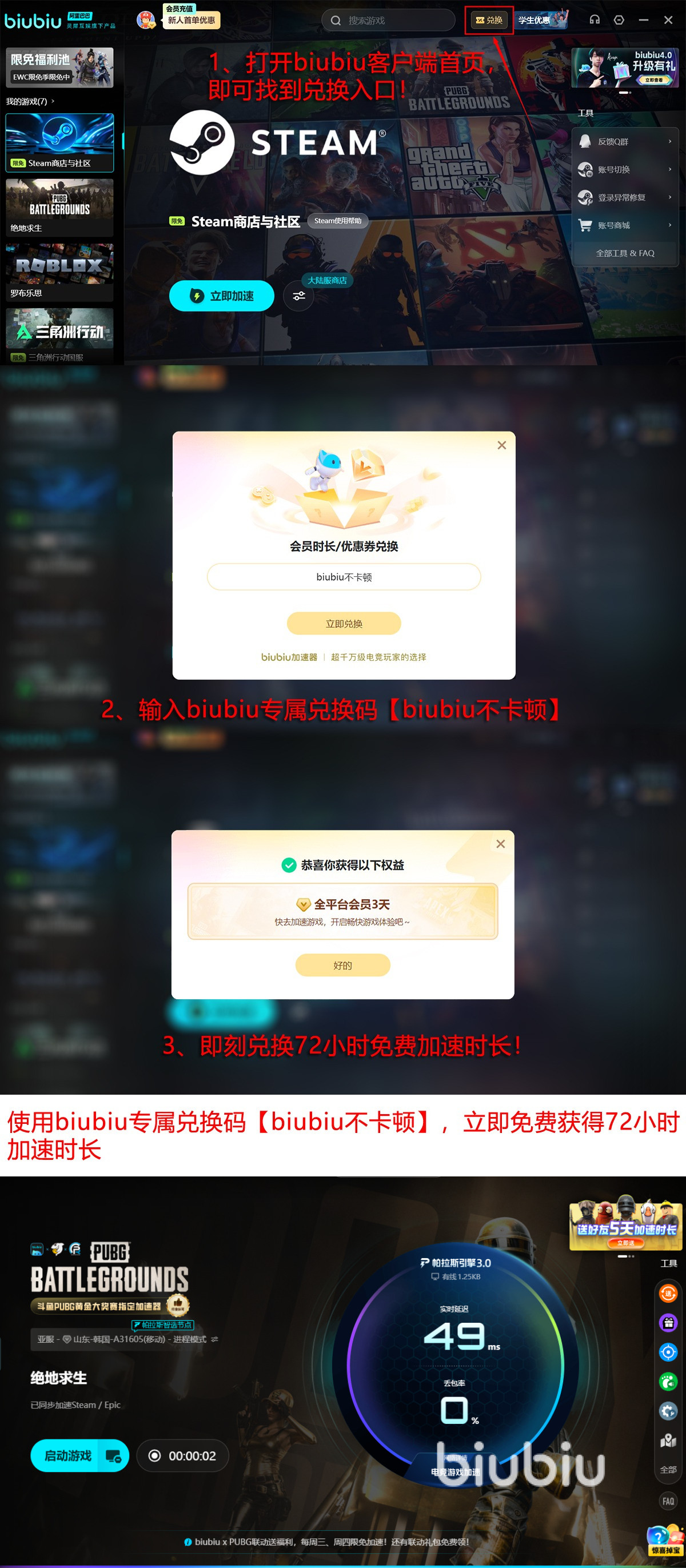 而为了钻研加速器各项指标是否能达到极度发挥效果,biubiu专门邀请了绝地求生世界冠军XDD来进行代言,两者在彼此的专业团队鉴定和改善之下,让该加速器和此游戏的契合性达到非常高的水平,且其战队在出征各种世界类型赛事时均使用的该款加速器,所以站在普通玩家的角度来说绝对够用,如果是新用户的话,首次到biubiu注册登录能领取24小时免费加速,后面不管新老用户输入兑换码【biubiu不卡顿】还能再领72小时,加起来96个小时,足够让你吃鸡无数次。