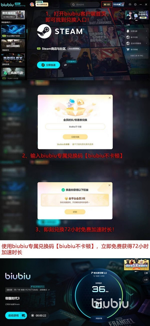 福利方面,biubiu也是毫不吝啬,给到了大家充足的试用时长,新老用户都可以使用口令码“biubiu不卡顿”来换取3天的全平台会员,这个是任何时间都可以用的,不过仅限一次,同时要注意区分大小写。然后新用户注册会自动领取到24小时的免费加速时长,这样对新人来说两种福利叠加就是96小时!