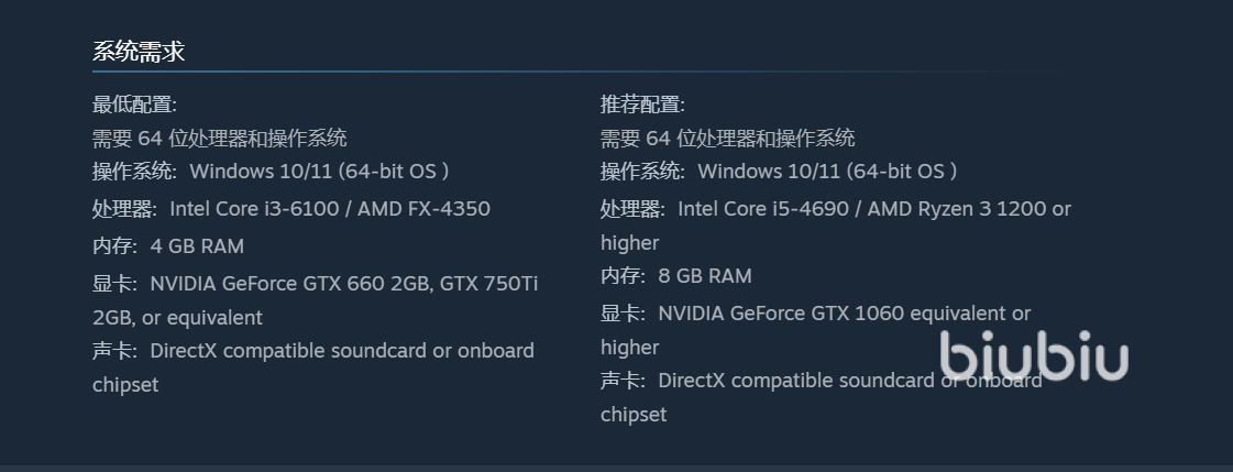 指尖碎裂的游戏整体配置很低,基本上多数游戏都是可以流畅运行的,其游戏配置要求系统是在Windows 10以及11,处理器在Intel Core i3-6100以上,同时内存4g,最后就是显卡方面需要NVIDIA GeForce GTX 660 2GB,下载空间大概5g就可以了,有需要的玩家们可以购买哦。