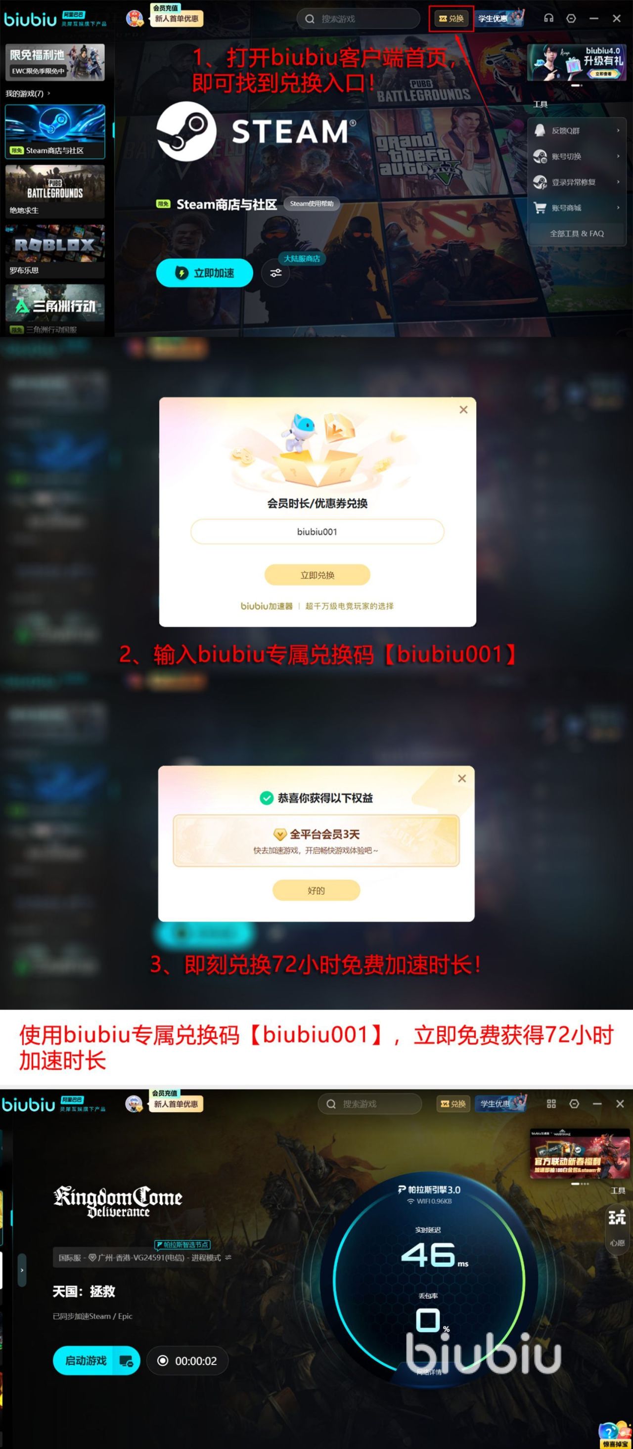 当前平台限时开放福利活动:所有用户输入激活口令【biubiu001】,即可领取72小时通用加速时长;新注册用户额外获赠24小时专属时长,累计达96小时免费体验权限,覆盖Windows、Android全平台主流游戏,无品类限制、无加速次数上限。