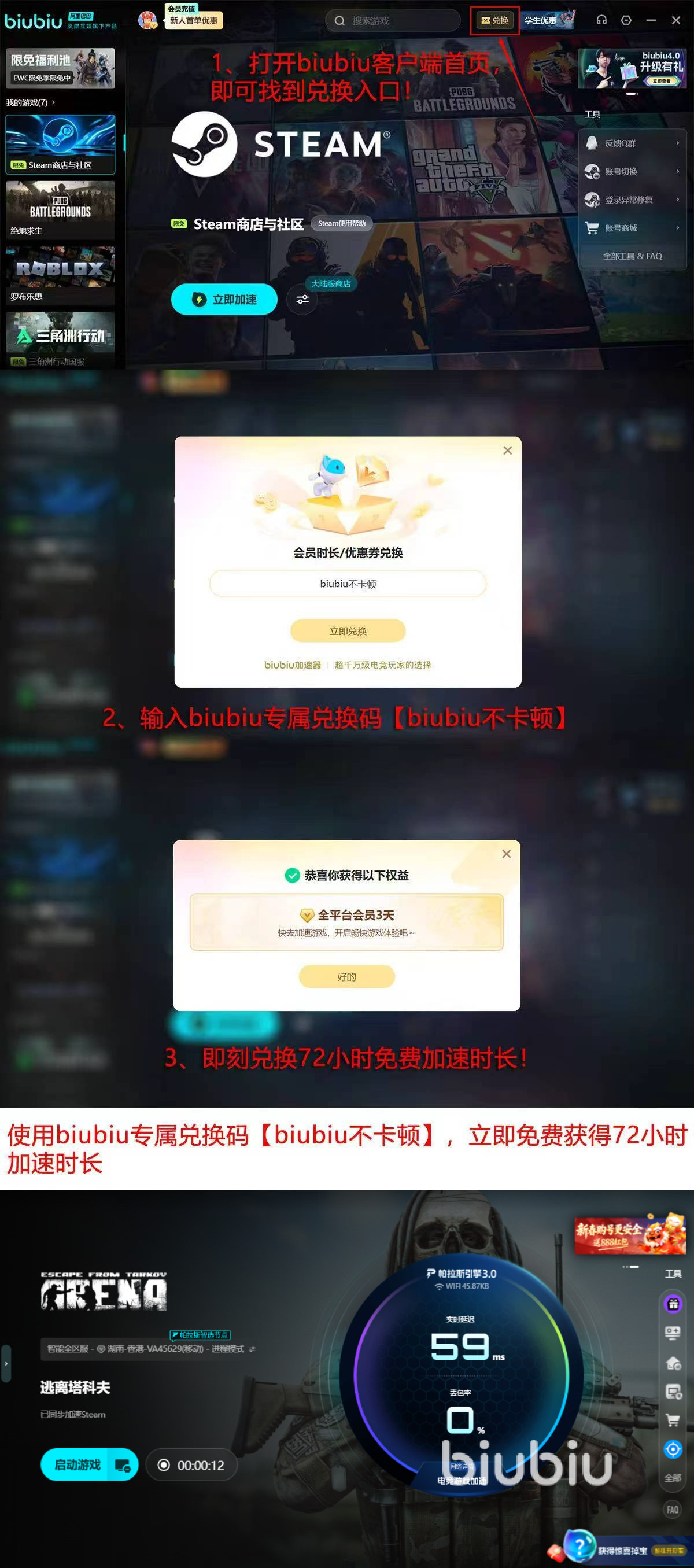 即刻启用biubiu加速器,解锁多重新手权益:新用户注册后首日可享24小时全功能免费试用;输入激活码【biubiu不卡顿】,额外获赠72小时加速时长,累计可连续使用达96小时(4天),充分覆盖多时段高强度战术演练需求。