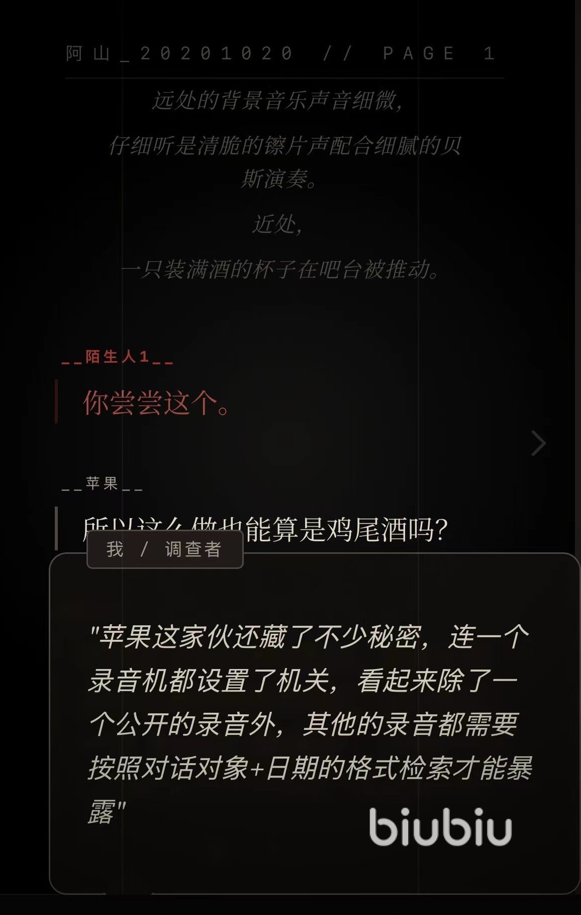 2026年02月27日 16:41 来源:小速昨日酒客是一款以文字推理为核心的叙事解谜游戏,玩家需通过梳理多重线索、比对时间线与人物关系,逐步揭开隐藏在复古酒吧背景下的真相。游戏整体界面简洁,但剧情架构扎实,采用非线性三线并行叙事结构,每条线索相互印证,逻辑闭环严密,无刻意误导设计,对新手玩家较为友好。