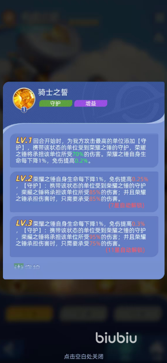 “骑士之誓”作为核心守护技,在每回合开始时自动生效,为我方攻击力最高的友方单位施加不可驱散的守护状态。该状态下,被守护者所受95%的伤害将由瓦尔德迪欧承担;且在瓦尔德迪欧达到11星后,其免伤率将随自身生命损耗动态提升——每损失1%最大生命值,即获得0.3%免伤(未达11星时为0.2%)。这一机制使其在残血阶段仍具备极强的抗压能力,大幅延长团队整体续航时间。