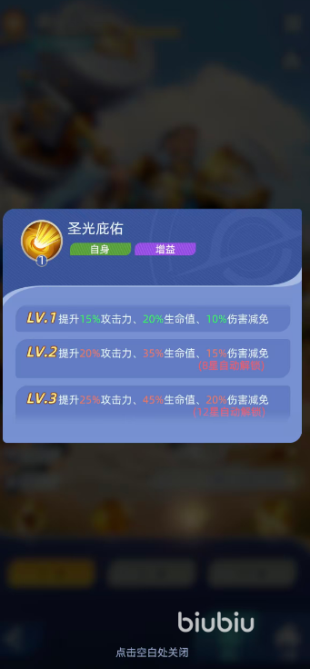 “圣光庇佑”是瓦尔德迪欧的关键自增益技能,初始提供15%攻击力、20%最大生命值及10%伤害减免三重强化。升至3级后(需角色升至12星解锁),三项属性增幅分别提升至25%攻击力、45%最大生命值与20%伤害减免,全面夯实其作为主坦的数值根基,也为后续搭配治疗、护盾类辅助角色预留充足成长空间。