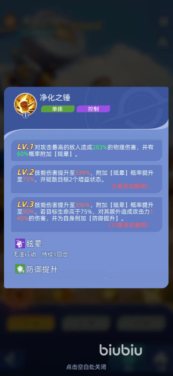 他的主动技能“荣耀之锤”兼具爆发输出与硬控压制效果:对敌方攻击力最高单位造成283%物理伤害,并有60%概率附加1回合眩晕。当该技能升至3级后,基础伤害提升至396%,眩晕触发概率同步跃升至90%;更关键的是新增条件判定——若目标当前生命值高于75%,将额外造成相当于瓦尔德迪欧自身攻击力140%的追加伤害;同时,施放该技能可为其自身提供防御力增益,显著强化其前排站桩稳定性。