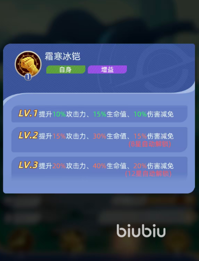 增益技“霜寒冰铠”专注强化泰斯特拉自身三维属性。基础形态提供10%攻击力、15%生命值与10%伤害减免;7星升至二级后增强为15%攻击力、30%生命值、15%减伤;12星解锁三级满阶效果,最终达成20%攻击力、40%生命值、20%伤害减免的全面增幅。该技能不可转移,但所有属性加成均作用于其全部技能效果,形成正向循环增益。