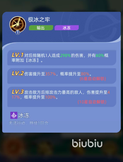 核心输出兼控场技“极冰之牢”,初始可对敌方后排随机单体造成298%攻击力的冰属性伤害,并有60%概率施加【冰冻】状态——使目标跳过下回合行动。该技能随星级提升持续强化:6星时伤害升至357%,冻结概率提升至80%;10星时进一步进化为定向锁定敌方后排攻击力最高者,伤害达417%,冻结概率稳定为100%,成为冰队中最具确定性的先手控场手段。