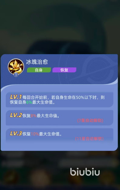 被动生存技“冰魄治愈”提供稳定的回合前自疗能力。当泰斯特拉生命值低于50%时,每回合开始前恢复自身6%最大生命值;7星解锁二级效果后提升至8%;最终在11星达成三级满阶,恢复量稳定为10%最大生命值。该机制显著延长其战场存活时间,为团队持续提供控制与增益支持。