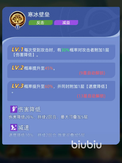 反击技“寒冰壁垒”赋予其高频率反制能力。每当受到攻击时,有30%概率使攻击者获得1层【伤害降低】效果(降低20%伤害,持续2回合,最多叠加5层);技能精研后触发概率提升至45%;13星时再次质变:概率升至60%,并额外附加1层【速度降低】(降低10%行动速度,持续2回合,同样可叠至5层)。该技能与“极冰之牢”构成双控组合——前者主攻先手压制,后者侧重持续反制,共同构建冰系阵容的节奏掌控优势。