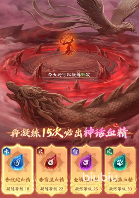 势力系统是前期战力补强的重要支点。势力捐献为获取势力贡献最快方式,每日享有5次免费捐献次数,不消耗任何资源,务必全额使用。势力贡献当前阶段应全部定向投入「血精凝练」,暂不兑换其他道具,确保战力成长不被稀释。凝练策略推荐优先完成水、火、雷、风四种橙色血精各一枚,四系均衡覆盖攻击、防御、暴击与闪避属性,带来全面战力加成;待四系橙色血精齐备后,再集中资源合力凝练神话血精,实现战力二次突破。