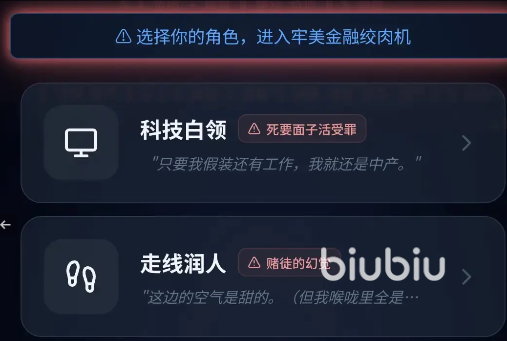 进入游戏后,玩家可自由选择科技白领、网络主播等不同职业路径。每种职业均配有专属红色文字说明,直观呈现其现实映射:科技白领表面光鲜,实则面临高强度加班与职业倦怠;网络主播虽具人气,却深陷流量焦虑与变现不稳定困境。