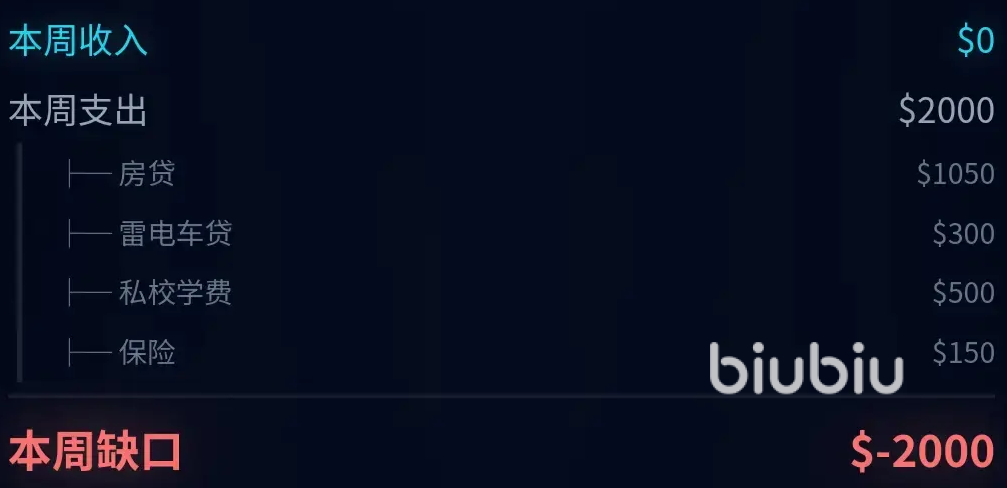 游戏内资金管理机制高度还原现实经济压力场景,涵盖生活日常开销、房贷、车贷、子女教育费用、商业保险支出等多个维度。收支失衡、账面赤字等状态将直接影响角色生存状态,强化代入感与策略性。