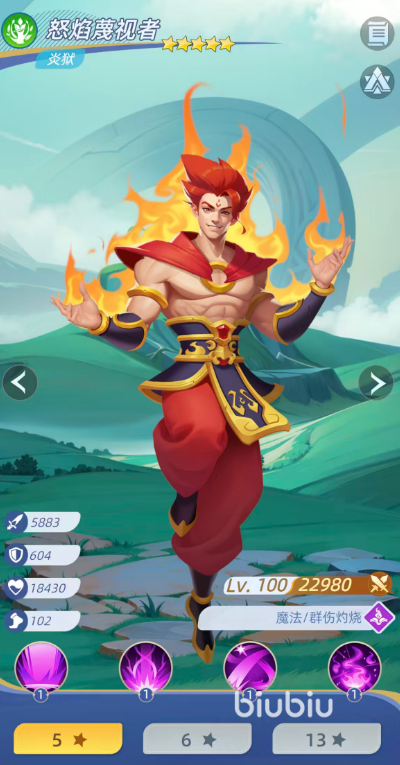 为强化灼烧覆盖率与元素协同,建议搭配火系角色怒焰蔑视者(炎狱)。其技能可对敌方前排与中排单位造成156%魔法伤害,并有30%概率附加【灼烧】;更值得注意的是,其普通攻击亦具备30%灼烧施加概率。这一设计大幅缩短了灼烧层数叠满所需回合,使队伍在第二回合即可进入高伤节奏。尚绮负责物理群攻与灼烧基础铺垫,炎狱则补足魔法灼烧维度,二者形成双轨灼烧体系,显著提升整体持续压制力。