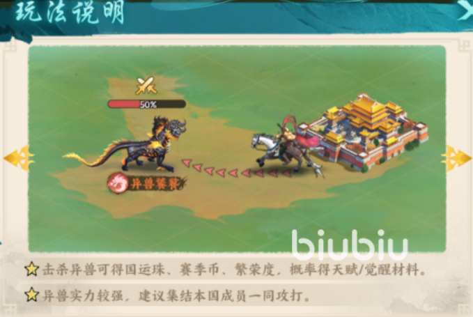 【异兽围猎】——挑战难度显著提升,单人作战成功率极低。成功击败后可获取国运珠、赛季币、繁荣度,并有概率获得天赋材料或觉醒材料——二者均为武将战力突破的关键资源。强烈建议组织本国盟友发起集结,以高协同效率达成稳定收益。