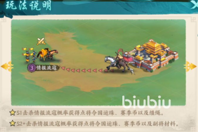 【情报流寇讨伐】——S1赛季击杀流寇可稳定掉落点将令、国运珠、赛季币及缰绳;S2赛季起,缰绳调整为副将培养材料,其余掉落项维持不变。该环节每日刷新次数固定,推荐每日定时清剿,保障资源持续入账。