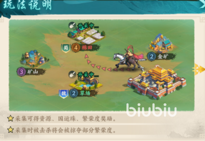 【资源采集】——在主地图指定区域采集基础物资时,同步获得国运珠与繁荣度。但该行为存在被敌对玩家拦截的风险:一旦角色被击败,将损失部分已积累的繁荣度。建议优先选择本国势力覆盖较密的区域作业,并保持实时地图观察。