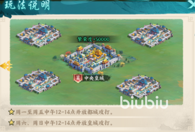 【跨服城池攻防】——分为两类时段:周一至周五中午12:00–14:00开放“都城攻打”,周六、周日同一时段升级为“皇城攻打”。成功攻破目标城池后,可掠夺守方一定比例的繁荣度;被摧毁的主城将在地图随机位置重生。周末皇城战为全服级大型对抗,参战规模、战术配合与奖励层级均远超平日,是提升个人与国家排名的核心窗口期。