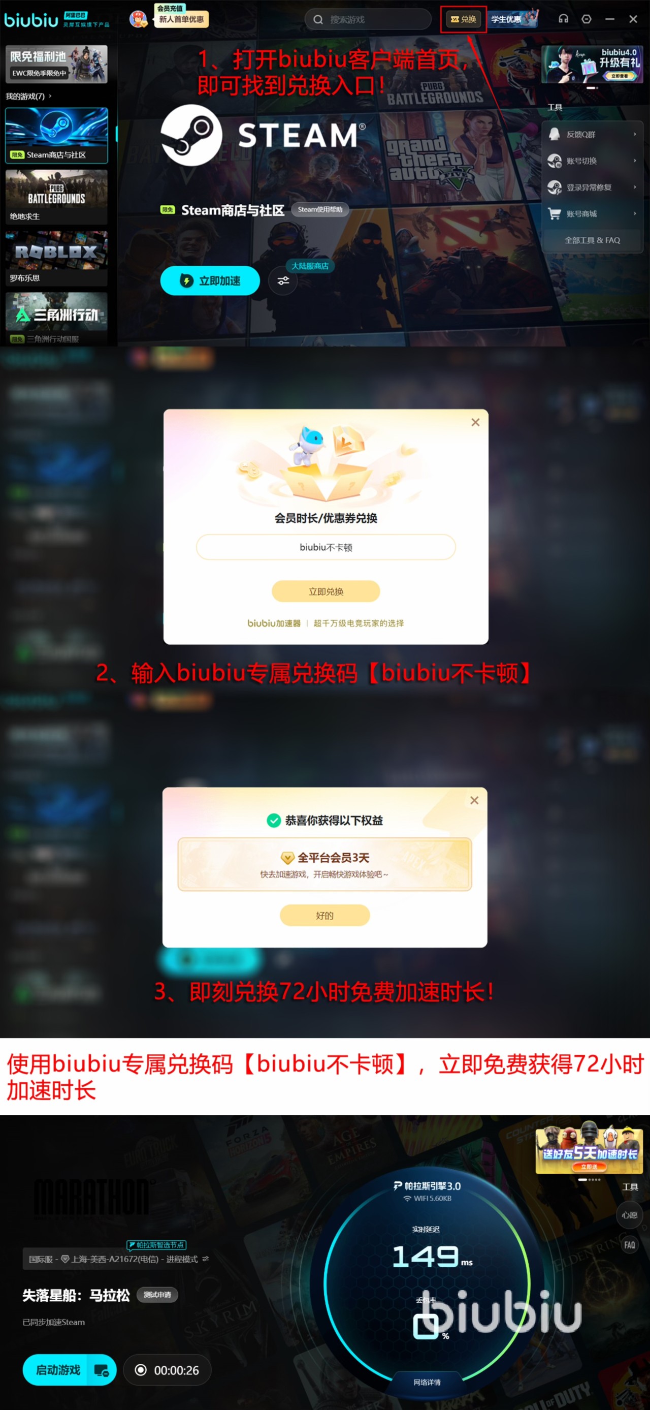 当前加速服务采用订阅制运营模式,新注册用户可直接获得24小时全功能试用权限;所有用户输入专属口令【biubiu不卡顿】,即可激活连续72小时高级加速服务,覆盖《失落星船马拉松》全部Steam服务器节点。