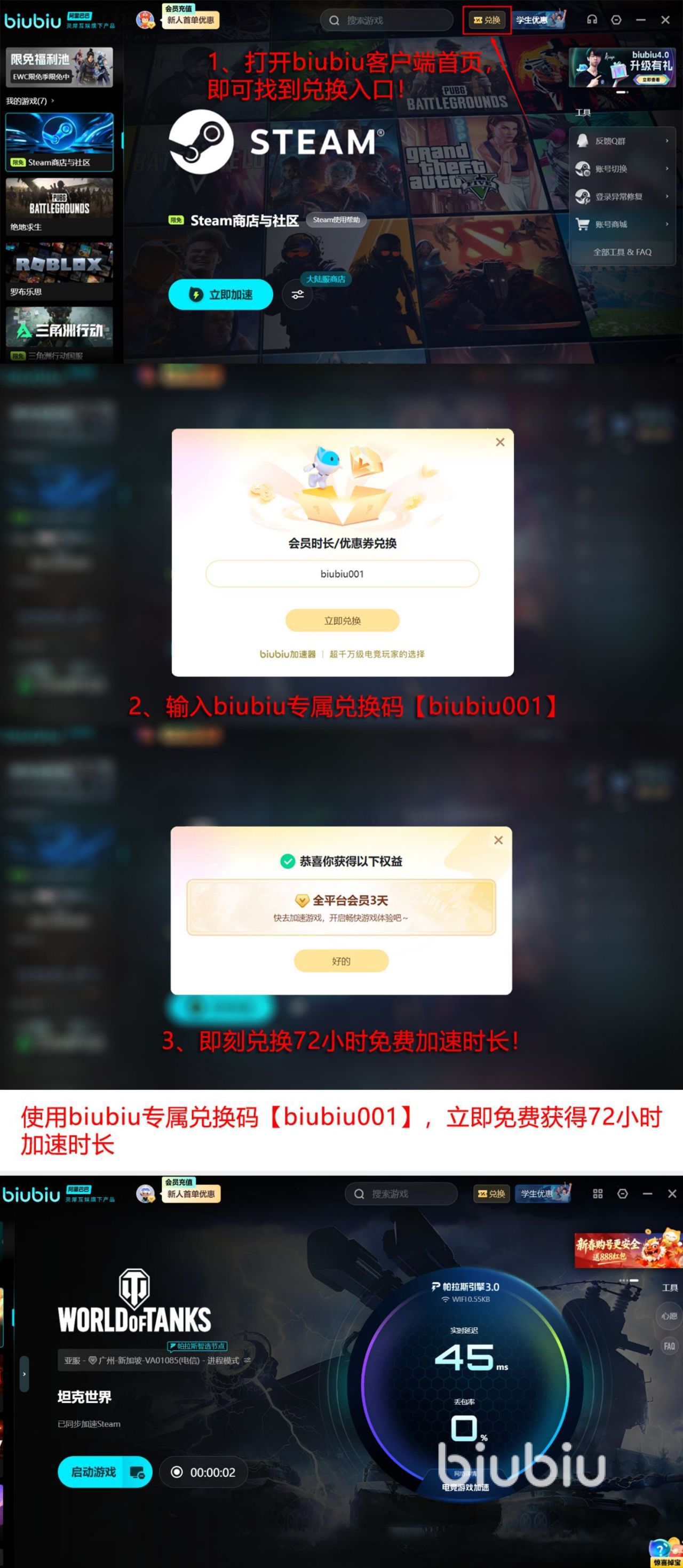 该加速器由阿里巴巴灵犀互娱研发运营,集成自研帕拉斯3.0引擎技术,在协议识别、数据压缩与传输优化层面具备深度适配能力。新用户完成注册即可获赠24小时免费加速时长;所有用户(含老用户)输入激活码【biubiu001】,均可额外领取三天全功能加速权益,累计达96小时。该福利适用于九游、交易猫及biubiu加速器三款阿里巴巴灵犀互娱旗下产品APP。