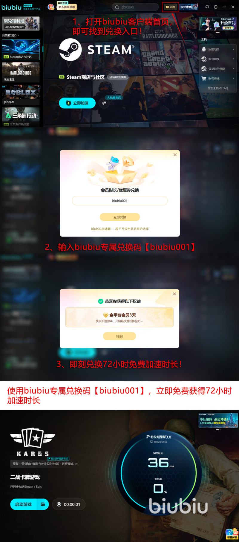 操作门槛方面,biubiu加速器采用极简交互逻辑:启动后于首页搜索栏输入“KARDS”,一键启用加速,全程无需手动配置协议或端口。新用户注册即赠24小时全功能免费试用期;完成首次登录后,输入专属兑换码【biubiu001】,还可额外激活3天连续加速权限。两项权益叠加,总计可享96小时无限制加速服务,覆盖完整新手体验周期。