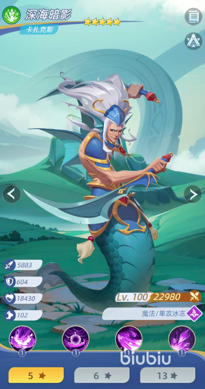 第二顺位推荐深海暗影卡扎克斯,专精单体冰冻与爆发输出。其核心技能“水窒”可对单一目标造成269%伤害并附加冰冻效果,初始触发率为50%,升至3级后提升至80%。除控场外,卡扎克斯具备异化强化机制,可提升自身输出阈值,并拥有驱散能力,有效应对敌方增益或负面状态干扰。在破冰机制强化后,其输出稳定性与终结能力显著增强,是冰冻队中不可替代的点杀与补刀担当。