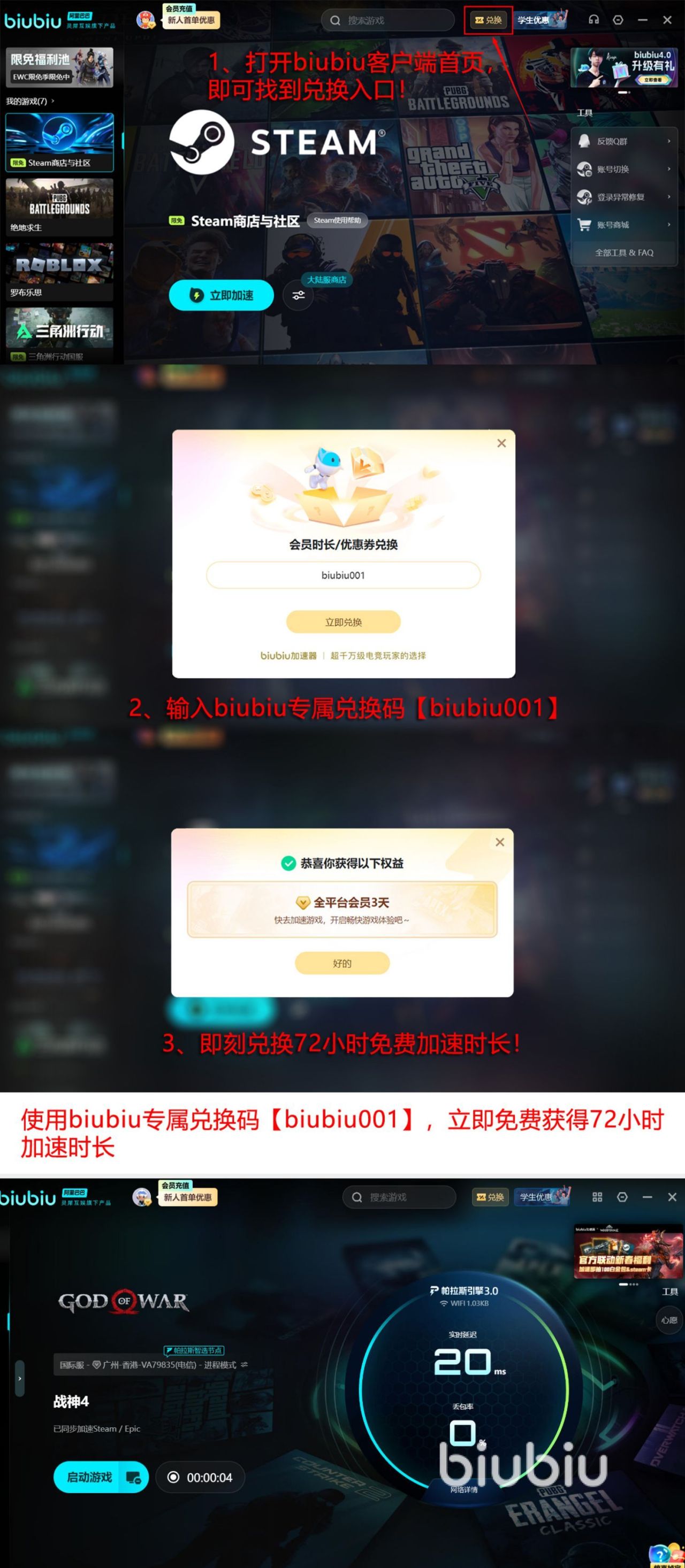 当前新老用户均可通过输入口令【biubiu001】领取72小时通用加速时长;新注册用户额外加赠24小时,合计享96小时免费体验。限免资源池按周轮动更新,全面覆盖《战神》系列所需节点类型,切实解决高延迟、跳ping、连接中断等典型问题。