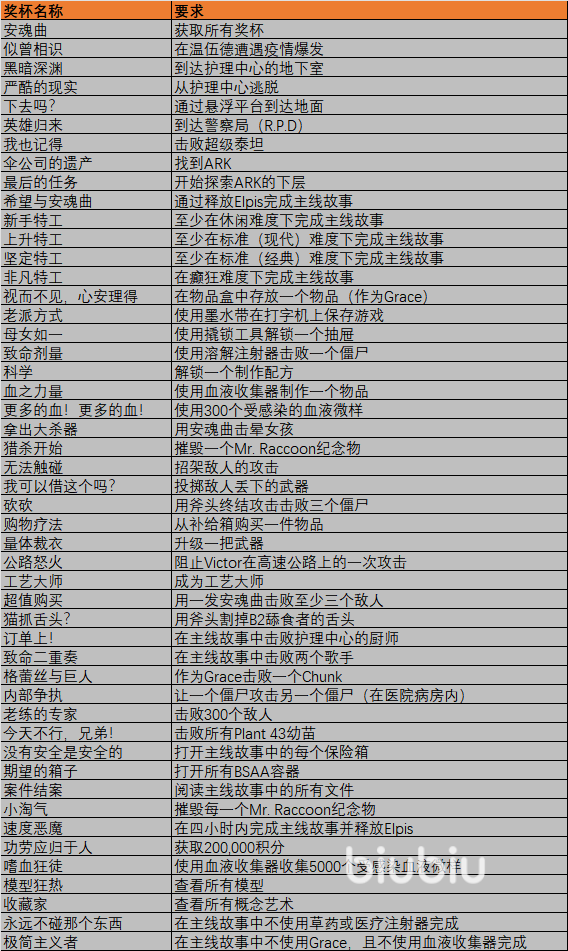 目前来看,想要达成全成就不仅需要有精准的操作,还得把地图探索个边。最令人头疼的就是“极速通关”和“最高难度”这两个奖杯。有一个名为“速度恶魔(speed deomon)”要求玩家在4个小时内通关。“卓越特攻remark agent”这个则需要再“癫狂(insanity)”难度下存活。此外还有诸如“不使用任何草药/注射器”、“不用采血器”等完成游戏,所以这一代肯定是要反复重玩的,具体的奖杯目录下面用表格给大家展示。