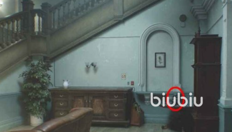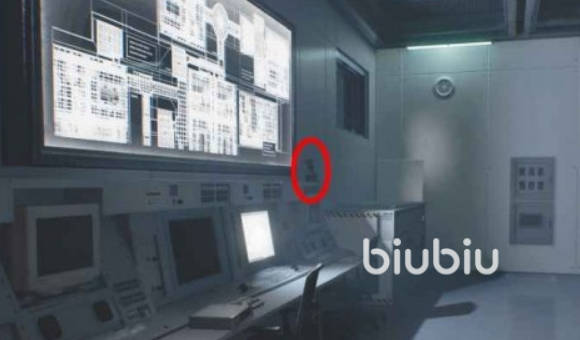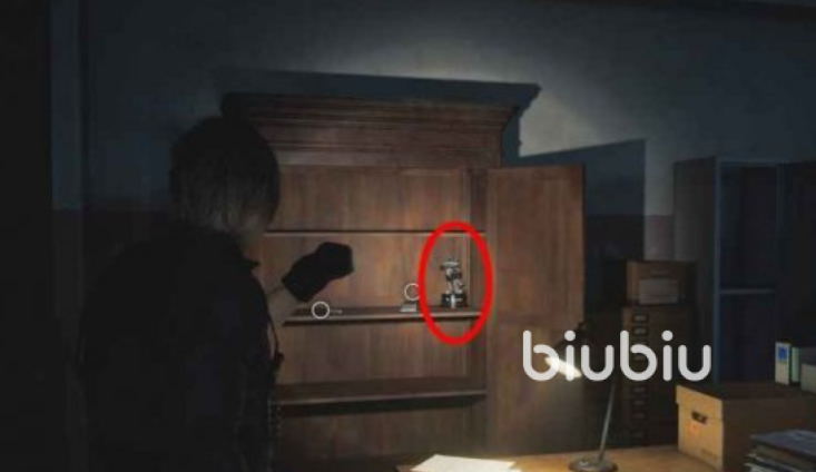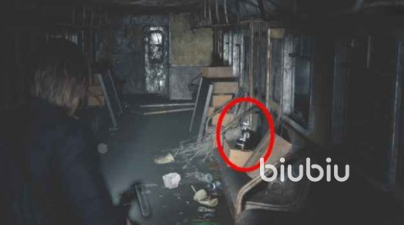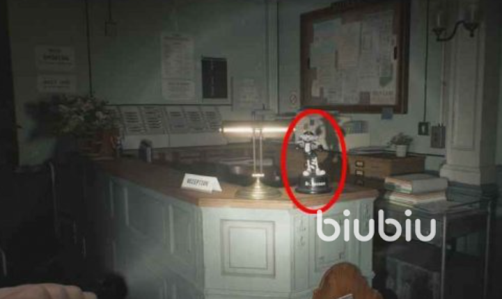 3、往候诊室以东的房间走,前往首席研究院办公室的楼梯处,走廊尽头可以看到有个道具在。